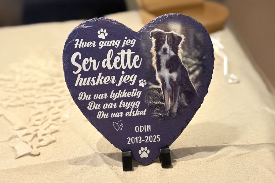 Lykkehund, her kan du bestille direkte gjennom vår samareidspartner og få våre rabatter, Du kan også kjøpe denne til katt eller kaniner. Det er 3 faste tekster man kan velge mellom, last opp ditt bilde, men navn og datoer. Husk å legg til vår rabattkode DKOSLO25 https://lykkehund.no/products/personlig-minnestein Pris med rabattkode DKOSLO25 kr. 899,- inkl. frakt Noen ukers leveringtid